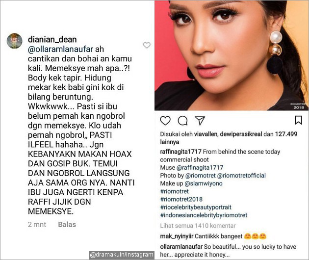 "Ah cantikan dan bohaian kamu kali, Memsye mah apa, Body kek tapir, hidung mekar kek babi," sindir haters dengan kasar. "Temui dan ngobrol langsung dengan orangnya, nanti ibu juga ngerti kenapa Raffi jijik sama memyse."